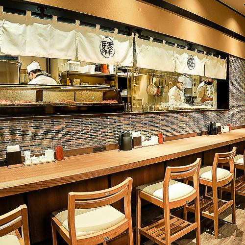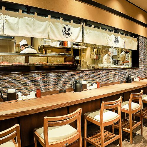 入口から右に入ると、目の前で職人が焼く姿をご覧いただきながらお食事を楽しむことができます。カウンター好きにはたまらないシズル感たっぷりのお席です。デートやお友達とワイワイ利用☆カウンターおすすめ